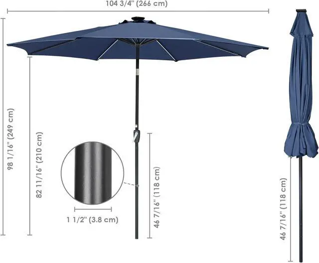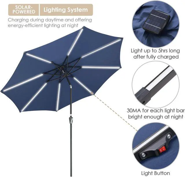 - Energy-saving Solar LED Umbrella - 9ft Patio Umbrella features LED strip lights, powered by solar panel, charging during daytime and lighting at dusk or night, offers efficient illumination, also great for setting romantic mood