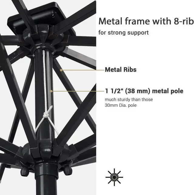• HEAVY DUTY: 9ft LED outdoor patio umbrella constructs with 8 Aluminum ribs and 1.5 diameter strong pole for durability