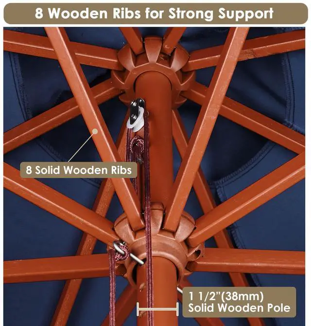 - Stylish Wooden Umbrella - 9 ft Wooden Patio Umbrella features wooden ribs & pole to show the beauty of nature, brightening the place with country style, enjoy the leisure time under the umbrella, feels like in a vacation