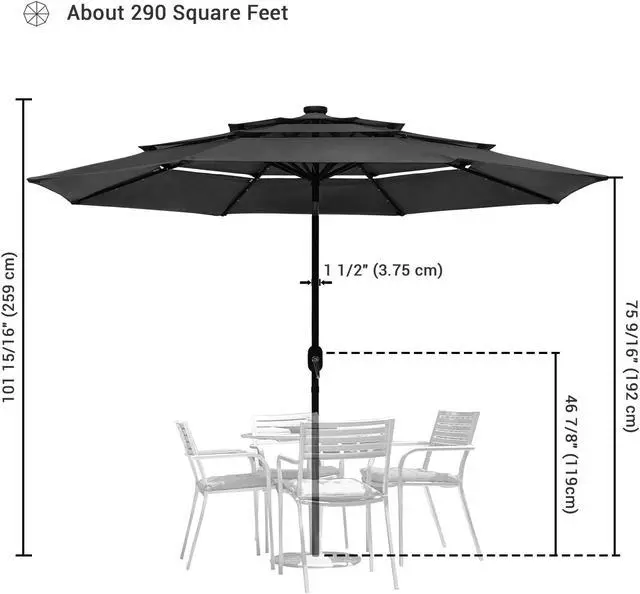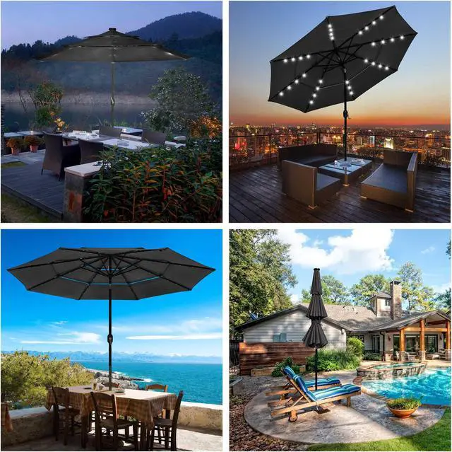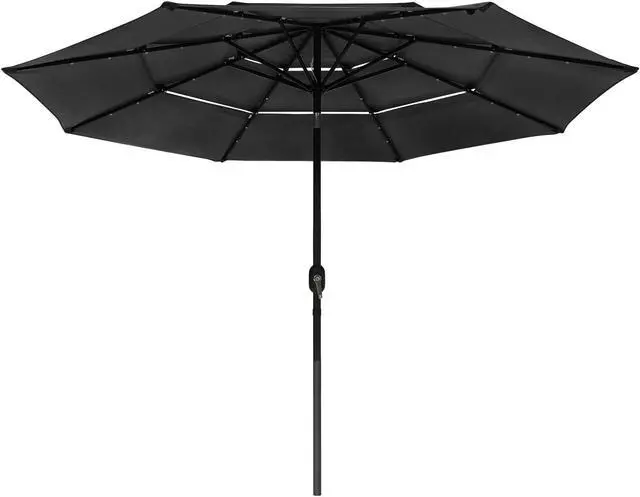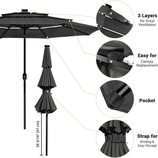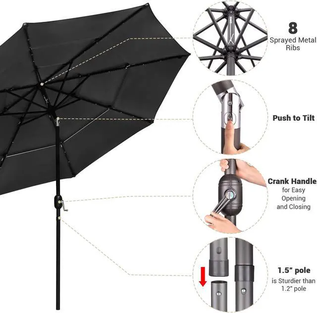 - Energy-saving Solar LED Umbrella - 10 ft 3 Tier Patio Umbrella features LED lights on ribs, powered by solar panel, charging during day to provide efficient illumination at dusk and night, eco-friendly and energy saving