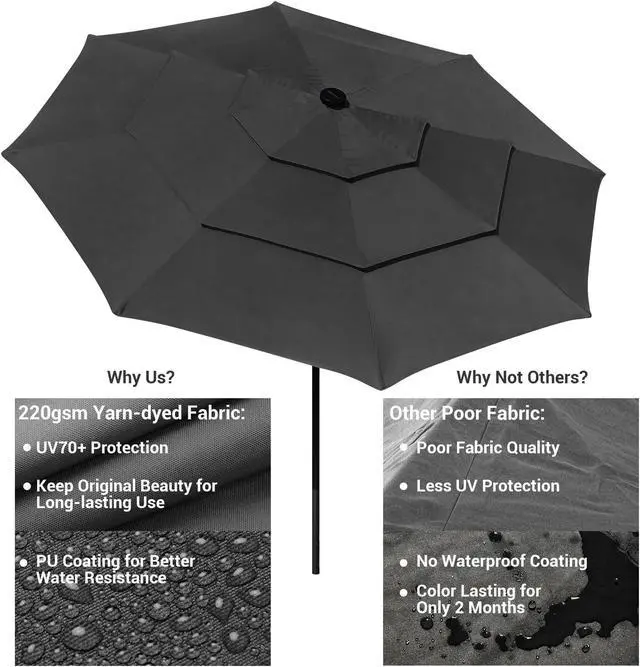 - Great Ventilation & Stylish Appearance - 3 layers for great ventilation, keeps air flowing to offer better stability, also making the shading area cooler; Unique layered umbrella shows leisure style, to enjoy your 3rd space leisure time with outdoor view on every sunny day