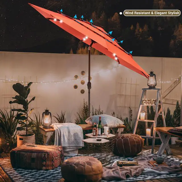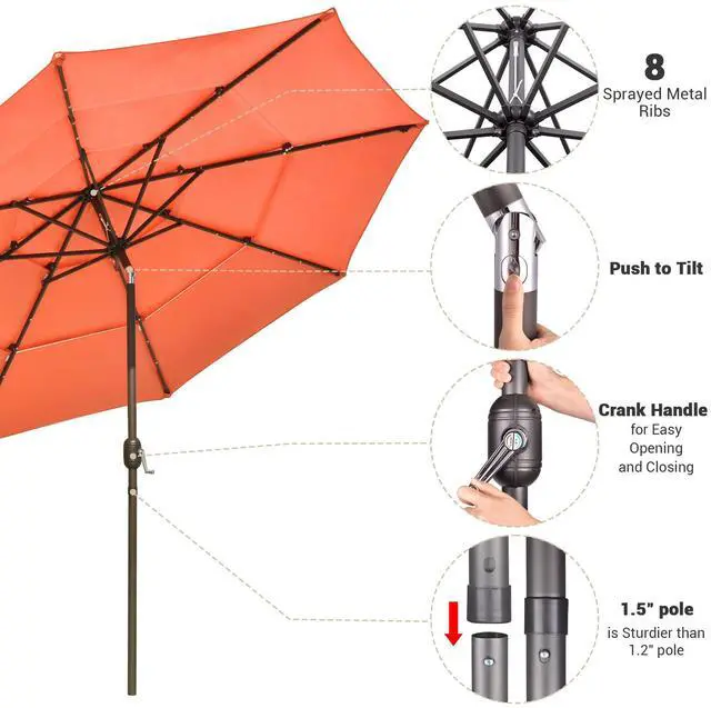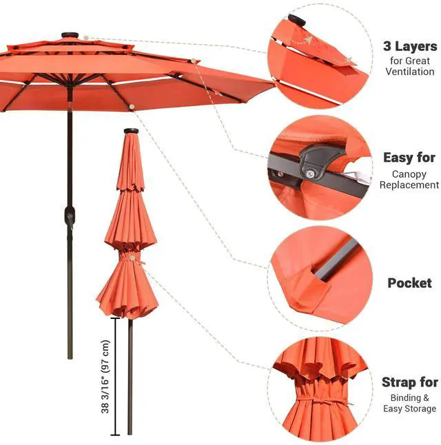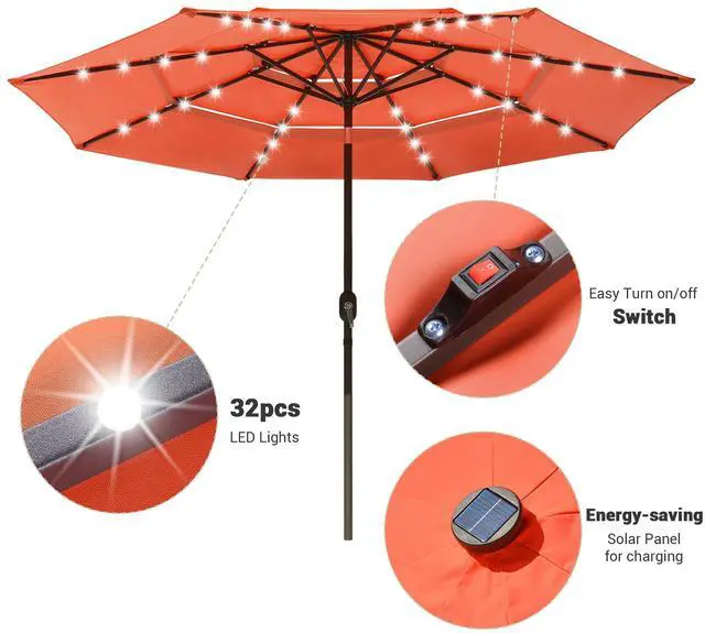 - Energy-saving Solar LED Umbrella - 10 ft 3 Tier Patio Umbrella features LED lights on ribs, powered by solar panel, charging during day to provide efficient illumination at dusk and night, eco-friendly and energy saving