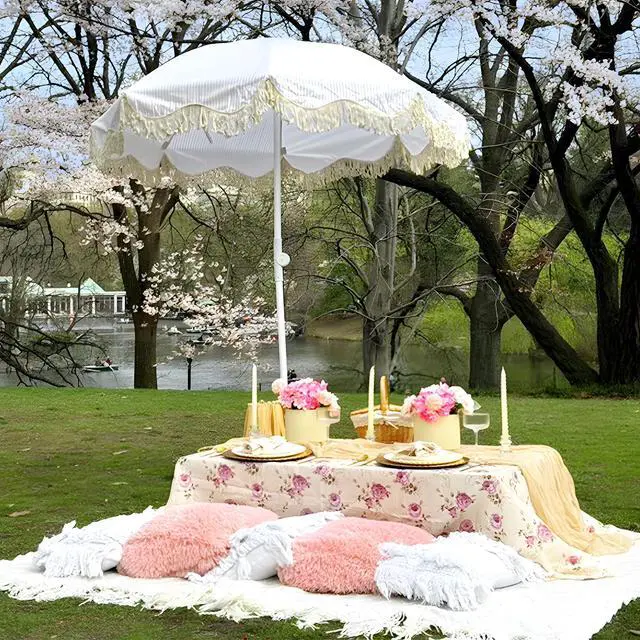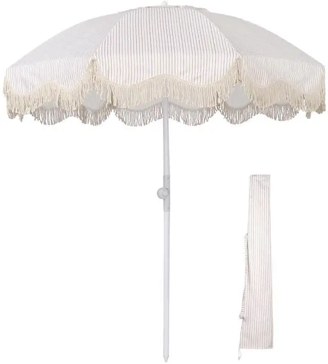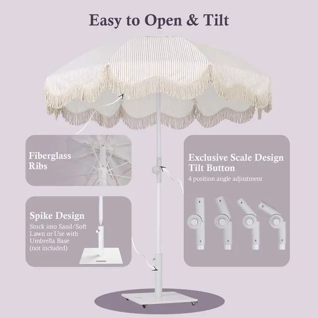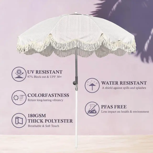 - Purple Striped Fringe Umbrella - Patio Umbrella with cotton fringes features purple-and-white stripes to evoke a playful elegance, bringing a serene charm to beaches, balconies, decks, gardens, outdoor picnics, alfresco restaurants, etc.