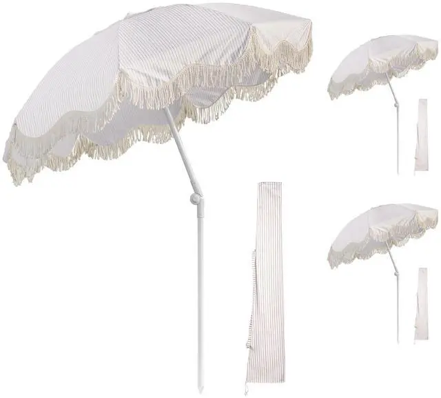 - Purple Striped Fringe Umbrella - LAGarden Set of 3 Patio Umbrellas with cotton fringes features purple-and-white stripes to evoke a playful elegance, bringing a serene charm to beaches, balconies, decks, gardens, outdoor picnics, alfresco restaurants, etc.