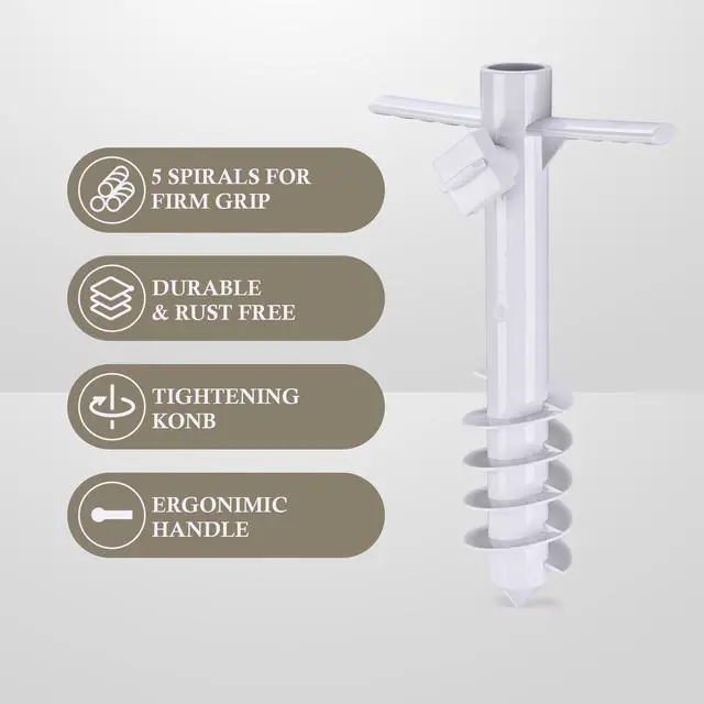 - 5-Spiral Design - Comes with a longer screw anchor with 5 spirals to ensure a firm grip, along with a large thumbscrew for tightening and securing your umbrella into the ground