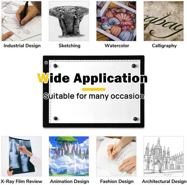 - A4 LED Drawing Board - 14"x10" Light Box comes with 4 magnets & 8 pcs tracing paper, perfect tool for sketching, diamond painting, 2D animation, calligraphy, embossing, stenciling, tattoo transferring, sewing projects, stained glass, clearly illuminating the hard-to-see lines for vinyl weeding & X ray film viewing, also suitable for professional tracing in architecture, design & drawing