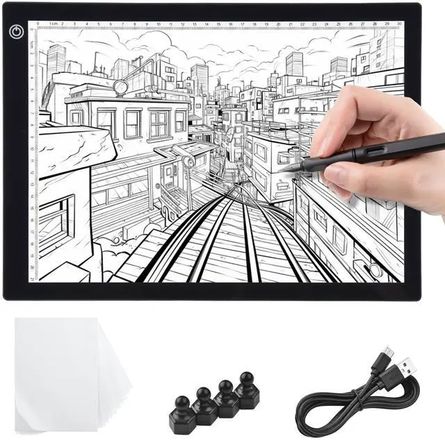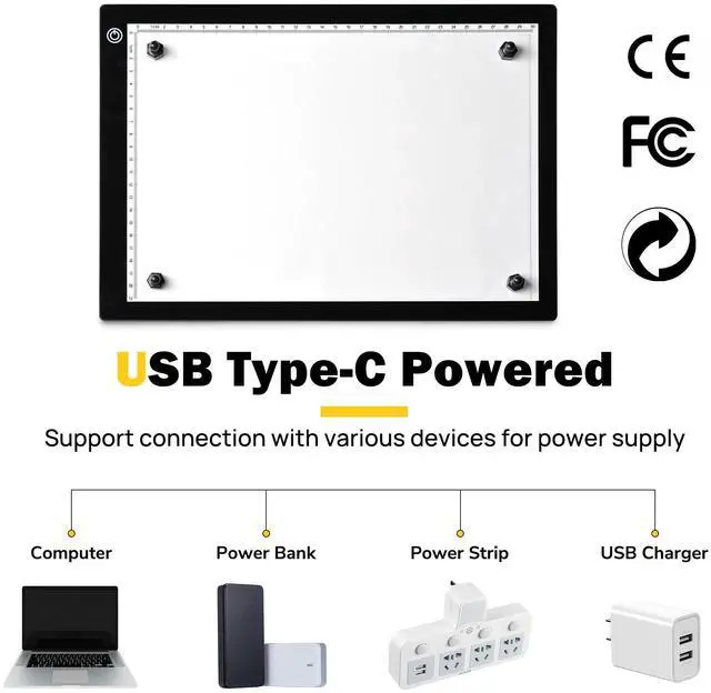 - USB Powered & Convenient - Comes with a USB Type-C power cable to connect the light box to any 5VDC output device, such as power bank, computer, USB charger, and power outlet; Features measuring borders to quickly scale your work, along with 4 magnets to hold tracing paper firmly in the magnetic zone of the light box without damaging your artwork