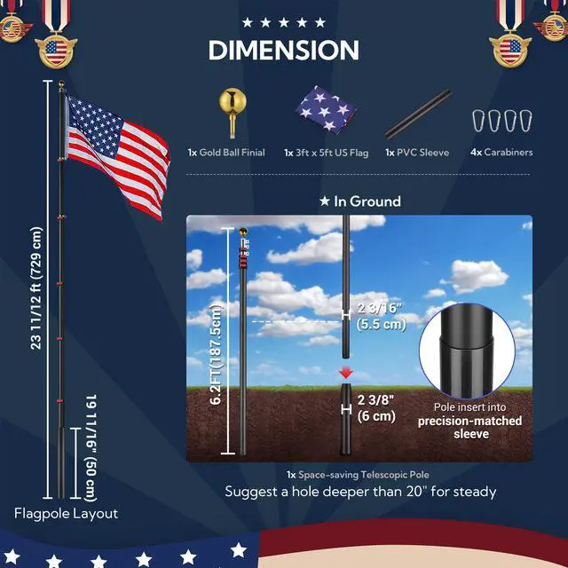 - Aluminum Telescoping Flagpole Kit - Includes a 25 ft aluminum telescopic flag pole,a golden top finial, US flag & PVC sleeve, offers you a complete kit to install the flag pole & show your patriotic spirit