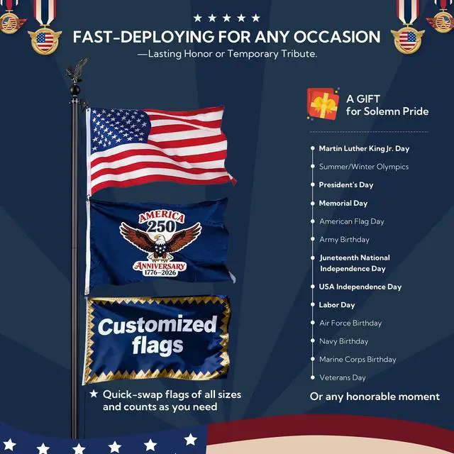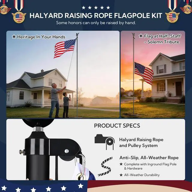 - Fly 2 Flags - Equipped with 4 carabineers for hanging 2 pcs 3x5 ft flags at the same time or a single pack of 4x6 ft flag such as national flag, state flag, or custom flag with other logo, and you can fly the national flag at half-mast to mark a special day or show your respect for someone