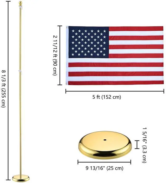 - Complete Flagpole Kit - Includes a 8 ft indoor sectional flagpole with gold ball finial, American national flag, base stand and accessories, one package for everything you need to display national flag indoors, decoration for government agencies, institutions, corridor, hallway, office, embassy, school, city hall, church, military ceremony for veterans
