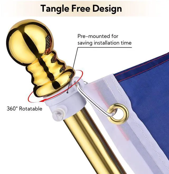 - Tangle Free Design - Flagpole features 360-degree rotatable rings to prevent the flag from being tangled or furled for keeping the flag neat and tidy; Upper ring is pre-mounted on the flagpole for saving installation time, while the bottom ring can be easily adjusted to any position & fastened by a knob