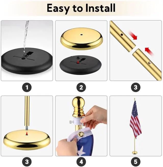 - Easy Assembly - Easy to set up without using any tool, just connect sectional poles, attach flag to the flagpole using carabiners, add water into the base, and finally rotate the flagpole into the base firmly; Detachable design for space-saving storage when not in use