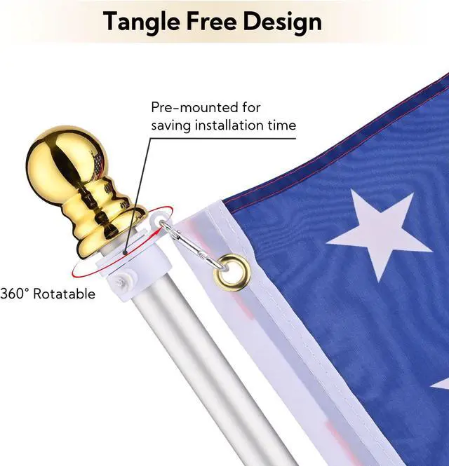 - Anti-Tangling Design Features a 360 degree rotatable upper carabiner pre-mounted on the pole, and an adjustable bottom carabiner for hanging the flag, preventing it from being tangled or furled for a neat and tidy display