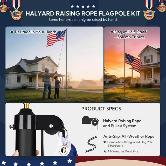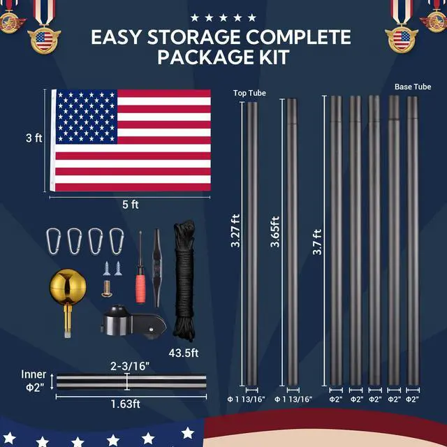- What You Get - 1-Year Warranty for quality assurance; Unpack to use, includes flag poles, ball finial, American National Flag, carabiners, screws, screwdriver, rope and PVC sleeve for protecting the bottom of the pole against corrosion