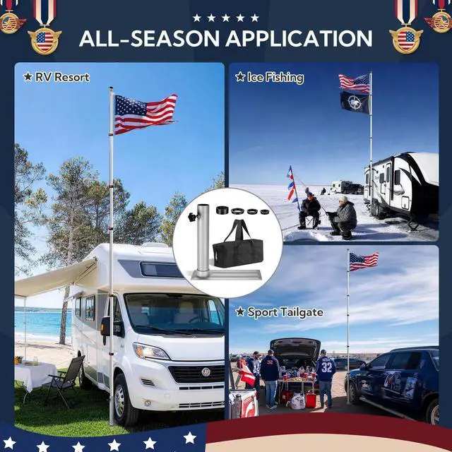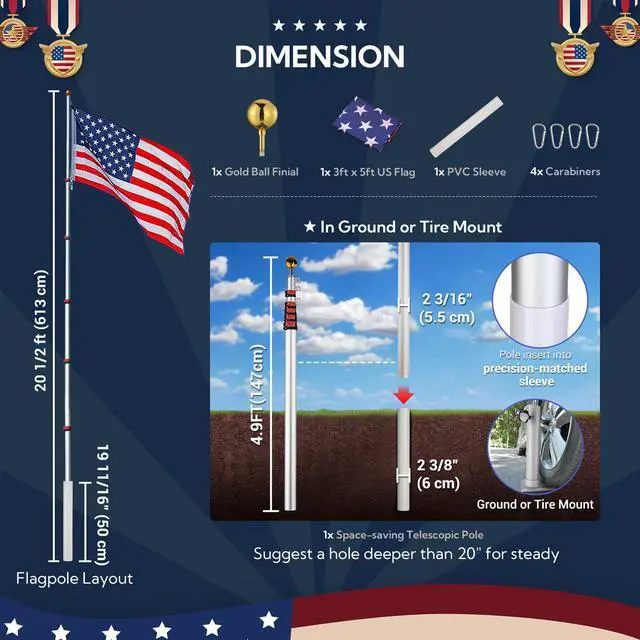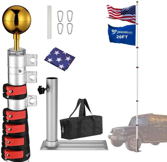 - 20ft aluminum telescoping Flagpole Kit with a golden top finial, ideal for front yard, garden, patio and commercial use