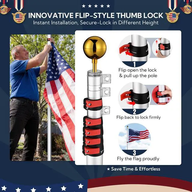 - Telescopic design allows to extend the pole lengths smoothly from 5ft to 12ft, 14ft or 20ft in minutes. And also retract quickly in the server weather, even strong windy day.A groundbreaking flip-style thumb lock, made of durable outdoor-grade nylon, firmly secures each section at your desired height. This ensures exceptional stability, preventing slippage or collapse. Built for longevity, the lock is designed to withstand outdoor conditions for up to 2 years.