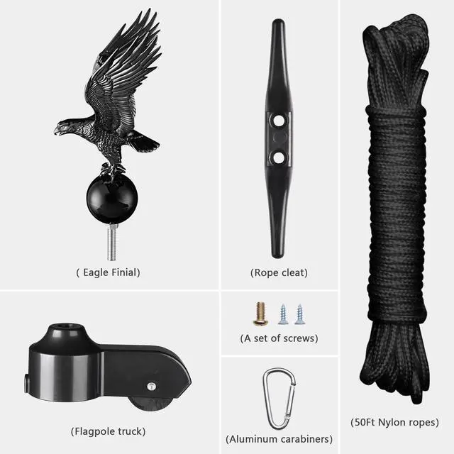 - Universal Flagpole Replacement Kit - Flag Pole Parts Repair Kit for 20/25/30 ft flagpoles with a diameter up to 1 7/8", includes 1 pcs black eagle topper, 1 pcs pulley truck, 1 pcs cleat hook, 2 pcs ropes & 4 pcs carabineers, a cost-effective option to replace your faded or torn accessories and upgrade the look without buying the flagpole