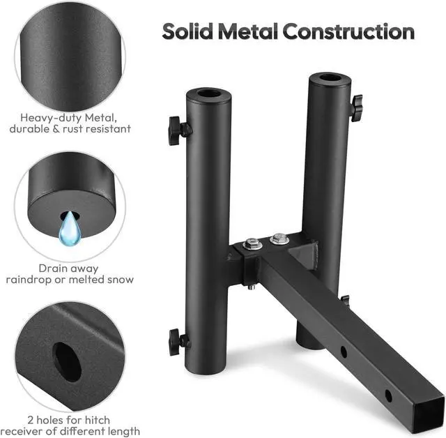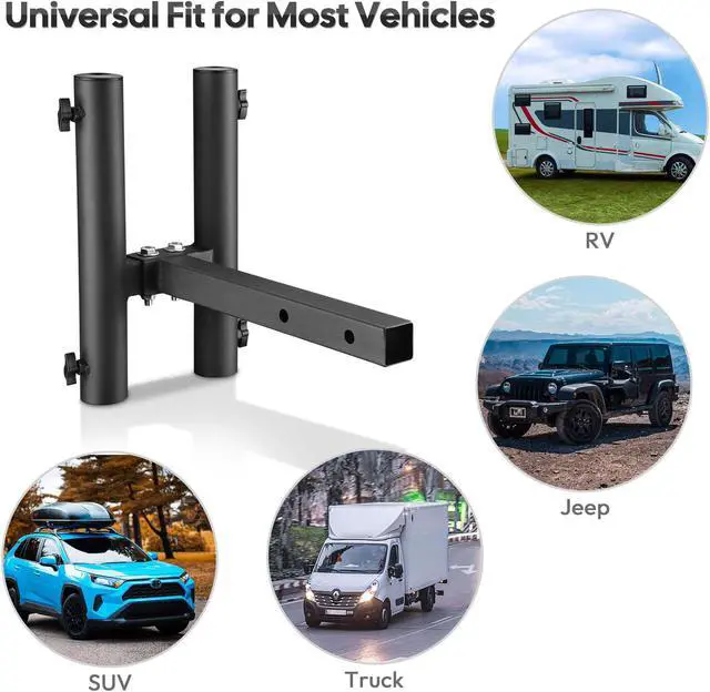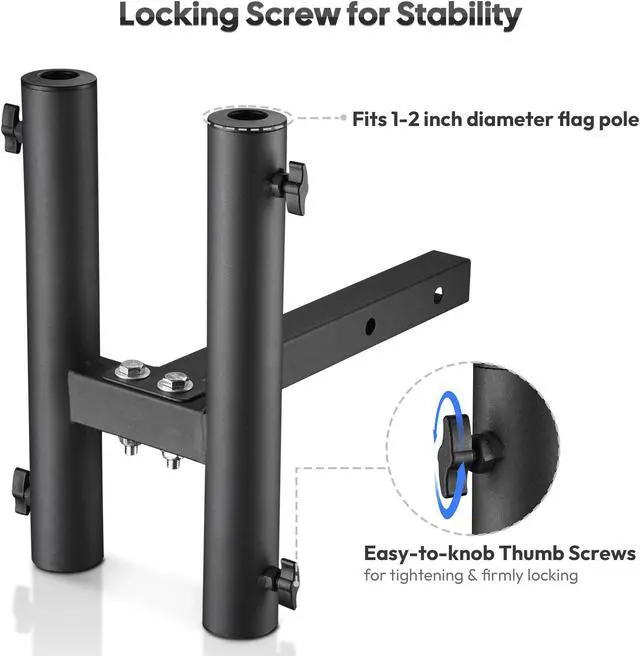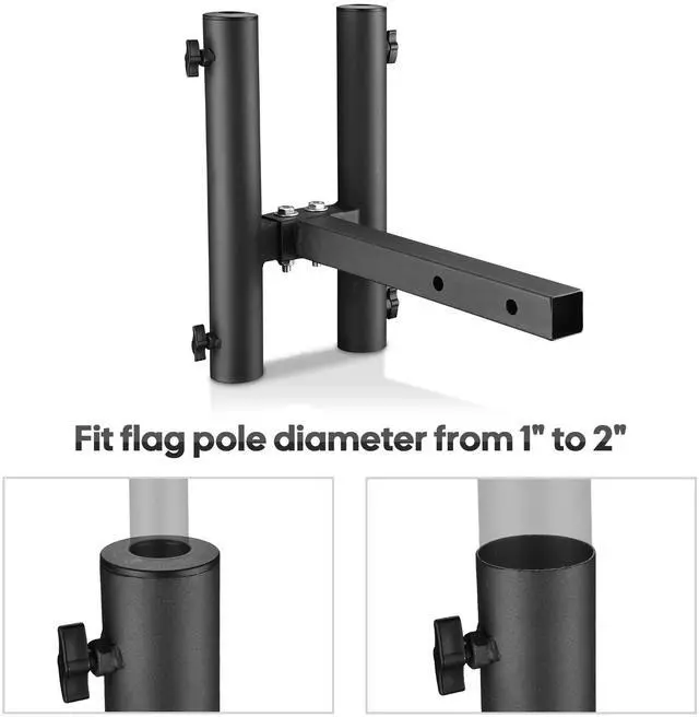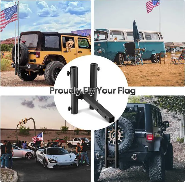 - Universal Compatibility - This Hitch-Mounted Car Flagpole Holder with 2 angled holders is designed to connect to the rear suspension, and is suitable for flagpoles with a diameter of 1" to 2", highly applicable on jeeps, RVs, SUVs, pickups, trucks, campers, and trailers with 1 9/16" receivers, allowing you to fix 2 flags at the same time while traveling