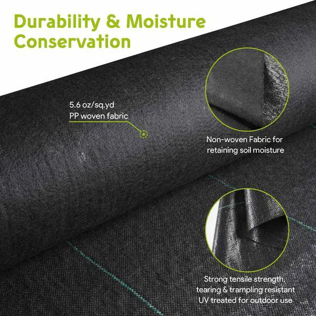 - Durability & Moisture Conservation - Made of heavy-duty 5.6 oz/sq.yd woven polypropylene with a layer of non-woven fabric, provides strong tensile strength to resist trampling while preventing the loss of soil moisture; Features UV resistance, not easy to get aging and fading for ensuring a longer lifespan of up to 5 years