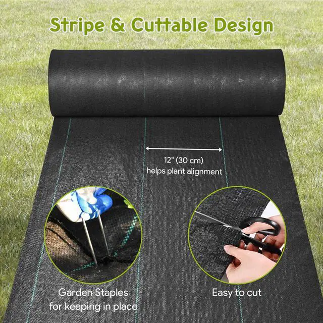 - Cuttable Design & Easy Installation - Green stripe sewn in landscape fabric every 12" (30 cm) helps plant alignment; Can be easily tailored to the size and shape of your garden bed, alongside with U-shaped lawn staples for securing landscape fabric in place firmly & preventing it from blowing away