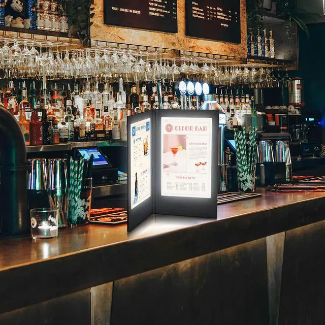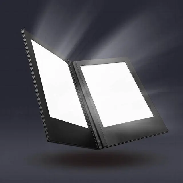 - LED-Lighted - Wechef 14"x10"x1" 2-Panel LED Backlit Menu Holder comes with an LED backlit board, which automatically lights up when It's opened, and goes off when closed or unfolded over 180 degrees, perfect for enabling customerso read the menu in dim and low-light environments
