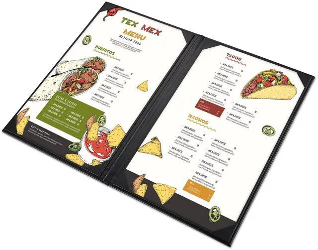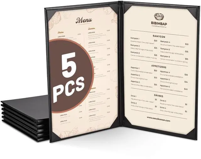 - Convenient & Elegant Design - Features 4 angled corners on each panel with slots for easy inserting the menu sheet and fixing it firmly, along with elegant leatherette trim for upgrading your taste and style instantly and leaving a deep impression on customersr>- Safe & Sturdy - Constructed by high-quality PU leather, the menu cover is safe, odorless, wear-and-tear resistant and non-shattering for ensuring long-lasting use and retaining a consistent appearance