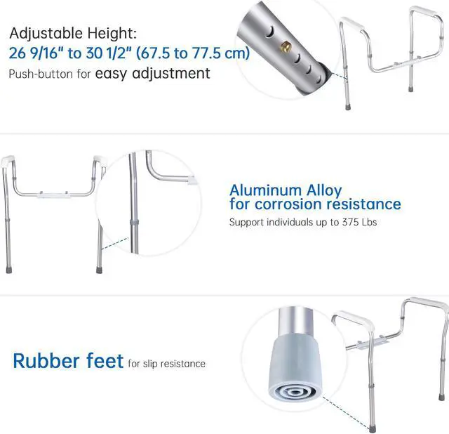- Adjustable Height - With adjustable height from 26 9/16" to 30 1/2", it can accommodate toilet seats of various heights, easy to use the push-button to adjust the desired height