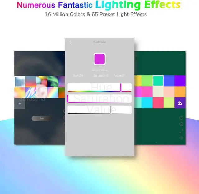 - 16 Million Colors & 65 Light Effects - 16 million color for you to customize the lighting effect, decorate your home with fascinating colors to make your life colorful and bright; 65 preset effects present dynamic and gorgeous lighting to add fancy beauty to set ambience; Also, more effects will be uploaded to App in the future