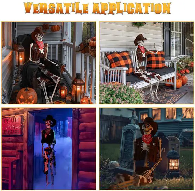 - Chic Cowboy Look - 2 Packs of 5 5/12 ft Tall Full Body Skeletons Halloween Decoration boast its trending cowboy look with a complete outfit of western hat, red scarf, fringe vest, and pants, paired with realistic human bones for double spooky effects, great prop and decoration for your Halloween party and festive celebration