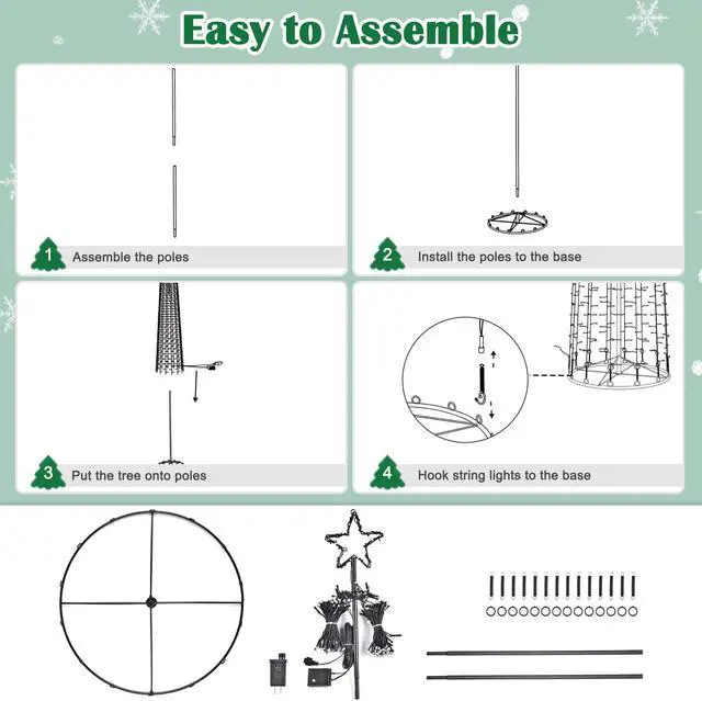 - Easy to Assemble & Disassemble - Easy setup in minutes without using tools, just install the poles to the base, put the Christmas tree lights onto poles and hook string lights to the base; Fully detachable poles for easy & space-saving storage, convenient to pack away for next year use