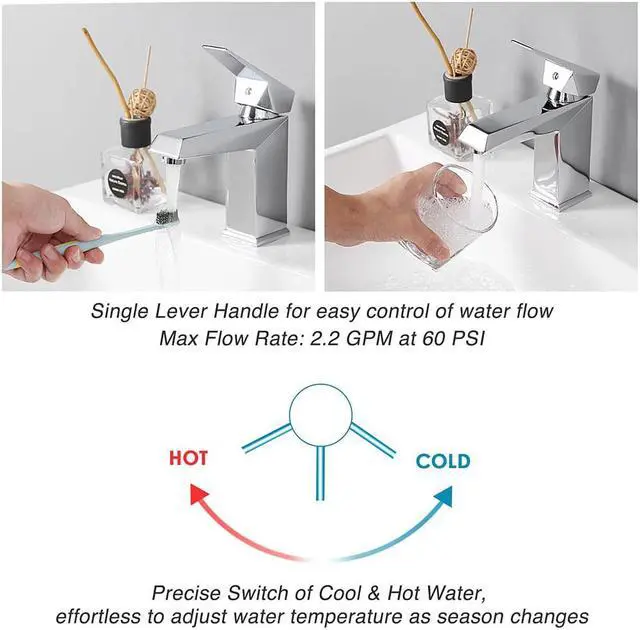 - Single Level Handle - Comes with an easy-to-operate single lever handle, simply lift up the handle to control the water flow volume with a maximum flow rate of 2.2 GPM at 60 PSI, and precisely switch hot or cold water by rotating the handle to left or right side to adjust water temperature