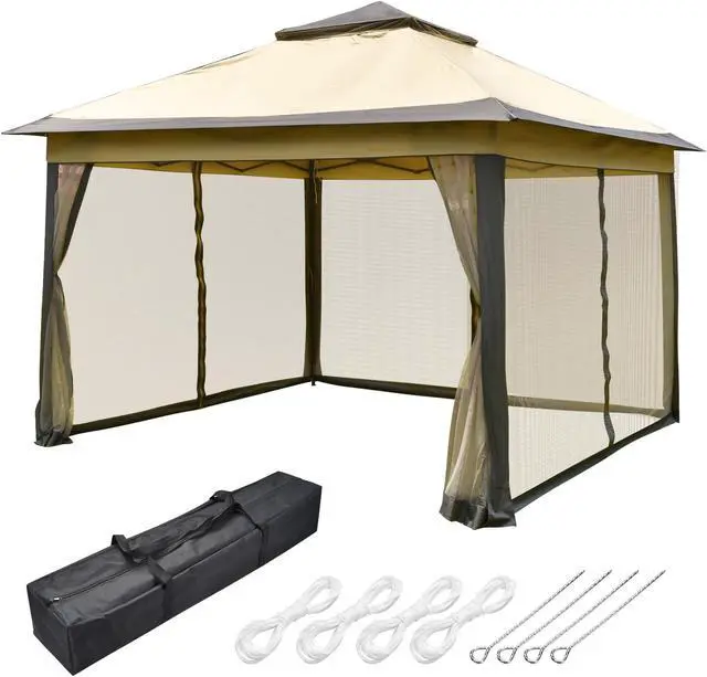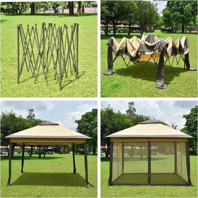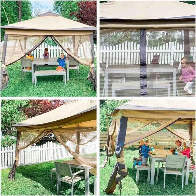 - All-in-1 Vintage Pavilion Appearance - 11x11ft Pop-Up Gazebo Tent with Netting Sidewalls provides room for approx. 6 people to sit under; Canopy with cornice brings classic beauty, mesh sidewalls with zippers can be collected while not using, gazebo shape likes a well-built cabin, perfectly compatible with your patio, backyard, courtyard
