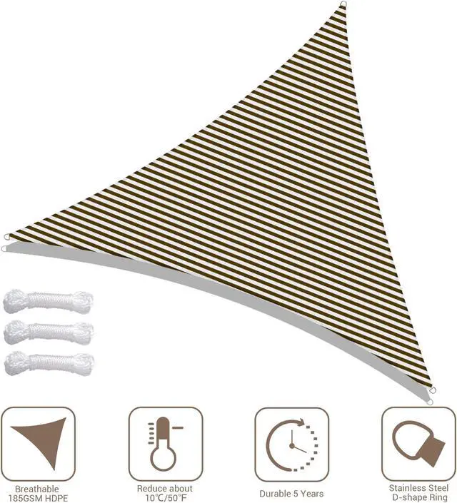 - Durable in Use - Triple stitched seam reinforces the edge to prevent fraying and ripping; Curved triangle shape helps the sail to keep tight; Heavy-duty nylon ropes included; Anti-ager composition added for long time service; 5-year warranty for quality issue