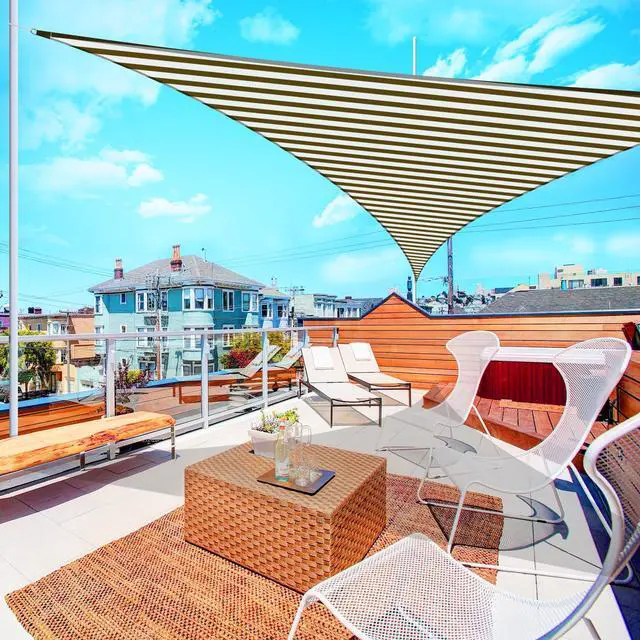 - Decorative & Effective Shading - 25 ft Equilateral Triangle Sun Shade Sail, gorgeous color to attract attention, a beautiful decoration for backyard, balcony, terrace, patio, porch, pergola, deck and so on; Also, a perfect sun shade to offer a shelter near the pool for swimmers to rest