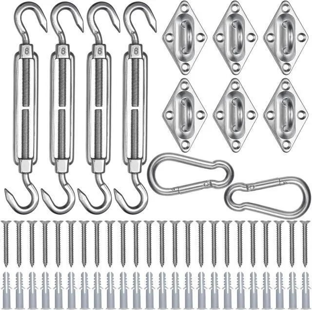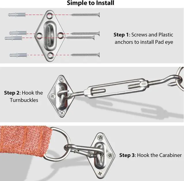 - Wide Application - 2 pack All in 1 Universal Triangle Sun Shade Sail Hardware Kits include 4 turnbuckles, 6 pad eyes, 2 carabiners and a set of screws, to hang the sun shade sail steadily on the wall, tree or pole, great for using at private patio, garden, coffee shop and swimming pool