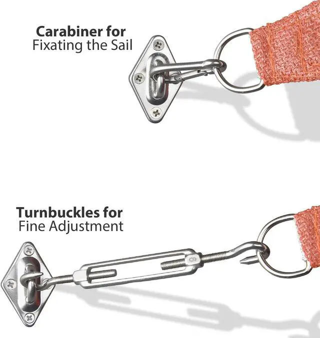 - Fine Adjustment - Carabiner for fixating the sail, turnbuckles to adjust the length between sail and mounting point from 6" to 8", add tension to fully expand the sail for keeping it steady on windy days, fine adjustment for better hanging performance