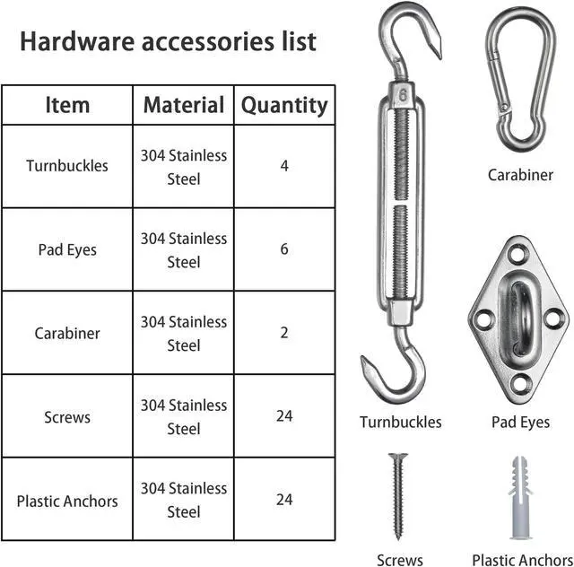 - Durable in Use - 304 stainless steel hardware features rust-resistance and wear-resistance, perfect for outdoor using and sturdy enough for sun shade sail installation