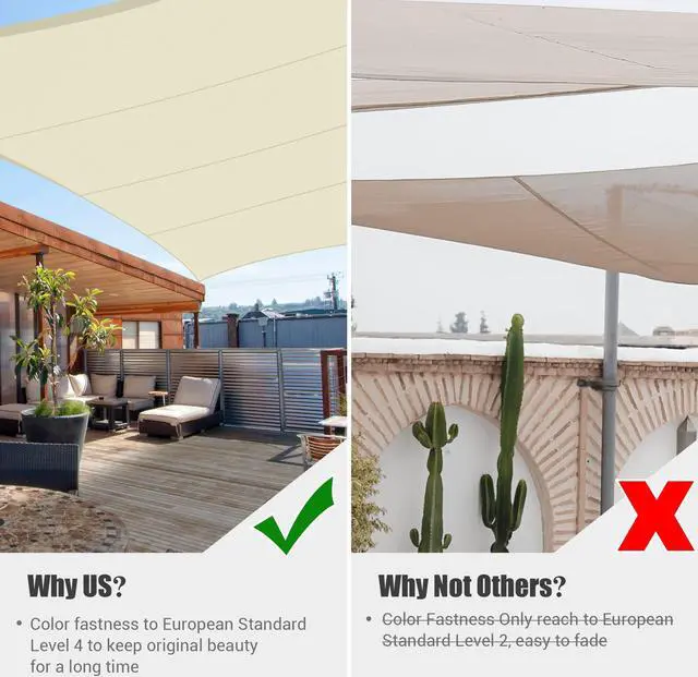 - Durable in Use - Double stitched seam reinforces the edge to prevent fraying and ripping; Curved square shape helps the sail to keep tight; Heavy-duty ropes included; Color fastness of European Level 4 to ensure original color to last for a long time; 2-year warranty for quality issue