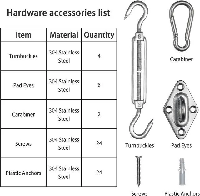 - Durable in Use - 304 stainless steel hardware features rust-resistance and wear-resistance, perfect for outdoor using and sturdy enough for sun shade sail installation