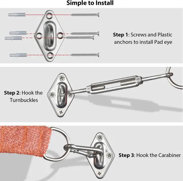 - Stable Construction - Pad eyes for hanging carabiner and turnbuckle, screwing installation guarantee its stability; Plastic anchors reinforce the screw to prevent pad eyes from pulling out