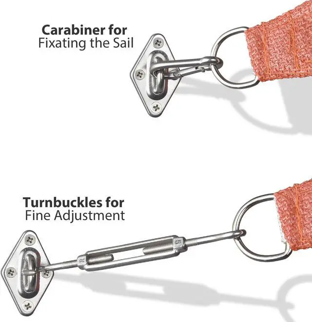 - Fine Adjustment - Carabiner for fixating the sail, turnbuckles to adjust the length between sail and mounting point from 5" to 7", add tension to fully expand the sail for keeping it steady on windy days, fine adjustment for better hanging performance