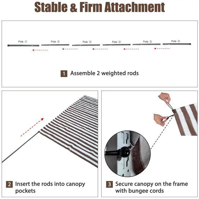 - Stable & Firm Attachment - Designed for easy and quick installation with two weighted rods and bungee cords, simply insert the weighted rod into canopy pockets and secure the canopy in place onto the pergola structure with bungee cords for stable attachment