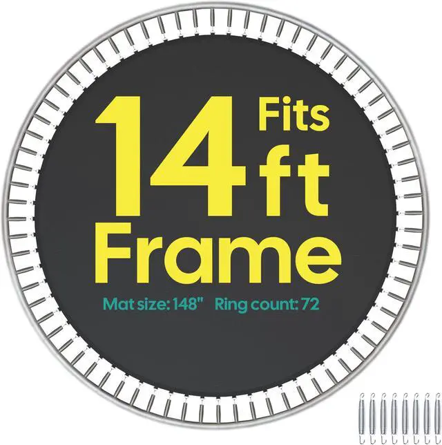 - Universal Mat - Trampoline mat with 72 V-ring loops features a diameter measuring 12 1/2 ft (including V-rings loops) fits trampoline with a diameter of 14 ft