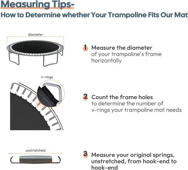 - Please measure the dimension of your trampoline frame and read our description carefully for the best match prior to your purchase.