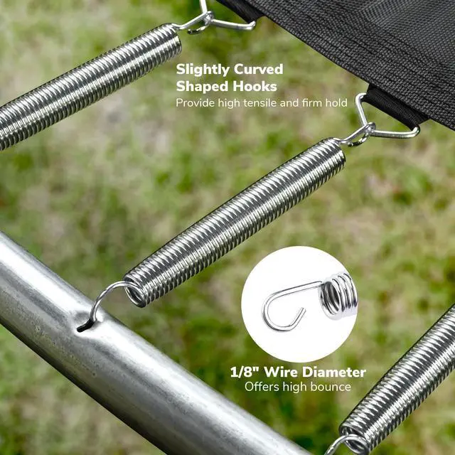- Curved Hook Design - Slightly curved shaped hooks on both sides of each spring provide high tensile and make springs hold firmly on the trampoline, ensuring you a safe jump without springs coming off