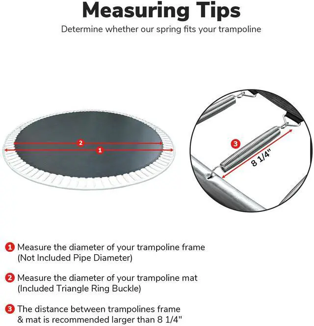 - High Bounce - 8 1/4" length springs with 1/8" wide wire diameter help to slowly transfer energy, resulting in high bounce to your trampoline and allowing you to enjoy a more exciting jumping experience