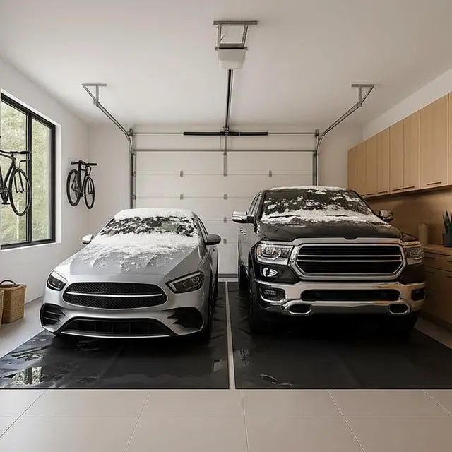 - Garage Floor Protector - This 16' x 7'9" Garage Floor Containment Mat features water-resistant surface and built-in raised foam edges to contain snow, ice, water and mud from cars and trucks and prevent from staining your garage, keeping your garage floor clean and mess free