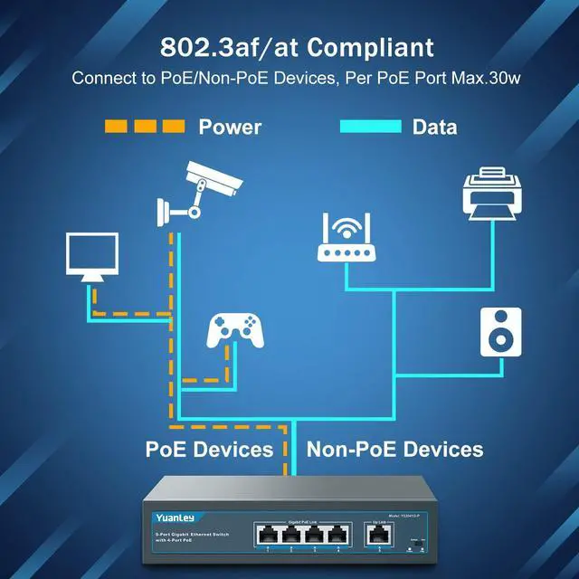 The PoE switch is equipped with full gigabit ports,can easily connect with PoE ready devices to your network with plug-and-play design.