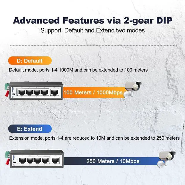 The long-range mode provides power and data delivery distance to 250m at 10Mbps operation on port 1-4. It's ideal for long-distance applications.