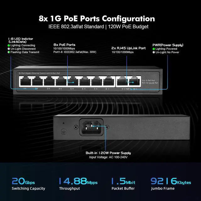 | Ethernet | 8* Gigabit PoE Ethernet Ports + 2* Gigabit Uplink Ethernet Port |